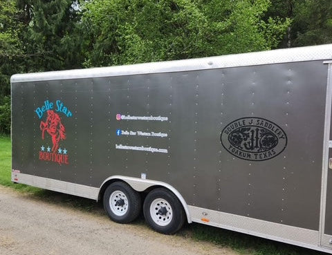 Belle Star Western Boutique is located in Canby, OR. We are currently a 28ft long cargo trailer and we travel all over the Pacific Northwest attending events such as barrel races, youth rodeos, high school rodeos, cutting shows, roping's, and more. Our current inventory includes items for men, women, kids, and can't forget our equine partners as well. The brands we are carrying are Stetson, Tin Haul, Roper, Rowdy Crowd Clothing, and Hooey just to name a few. For our custom leather items, we use Live Oak leather for tooling.