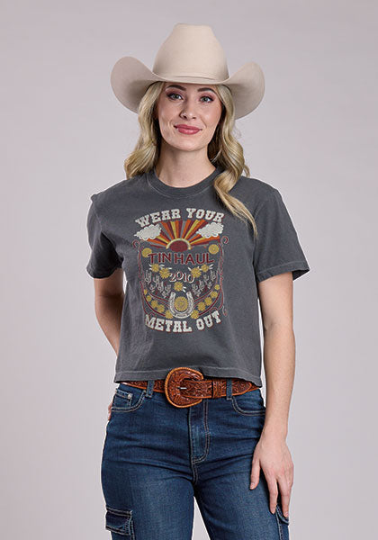 | Gals Gray Pigment Dyed Ringspun Cotton T-Shirt * Boxy Fit * Slightly Cropped * Ribbed Crew Neck Collar * Relaxed Fit * Multi Color "Wear Your Metal Out" Concert Style Screenprint On Front |